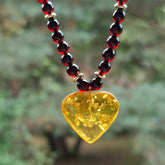 Composition of Baltic amber beaded necklace and pendant. Lemon heart shape Baltic amber pendant Cherry color Baltic amber beads Brass metal clasp Round beads: 6mm Heart size; ~26x26 mm 100% nickel and lead free Necklace length: 42 cm | 16.53 inches Weight ~11.5g- €138,75