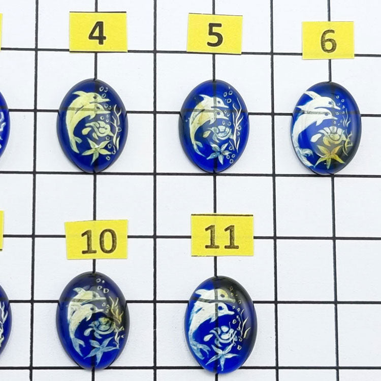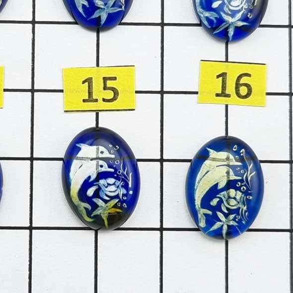 Natural Caribbean blue color bottom engraved dolphins amber oval shape cabochons Genuine Caribbean amber Carved/Engraved Intaglio Dolphins Oval shape calibrated cabochons Size: 12x16mm | 0.47x0.62 inches Blue color bottom...