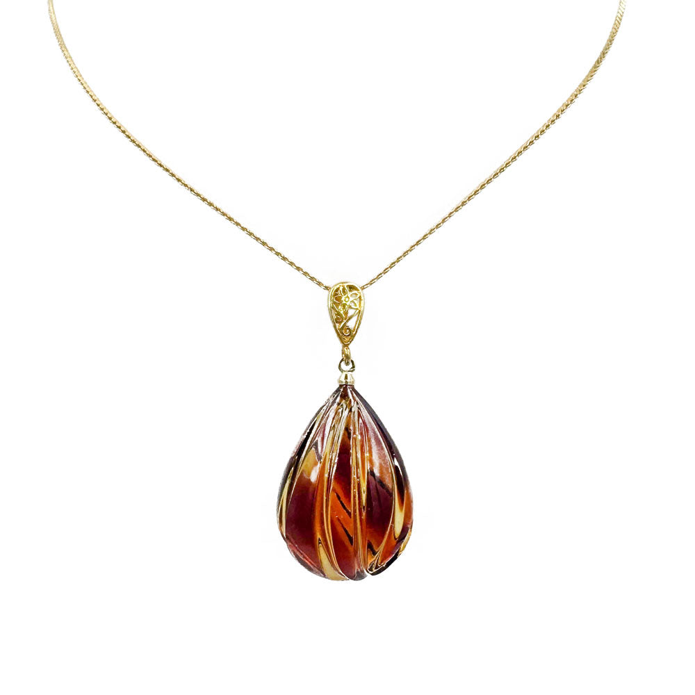 Carved Gradient Amber Drop Pendant & Chain Necklace 14K Gold Plated