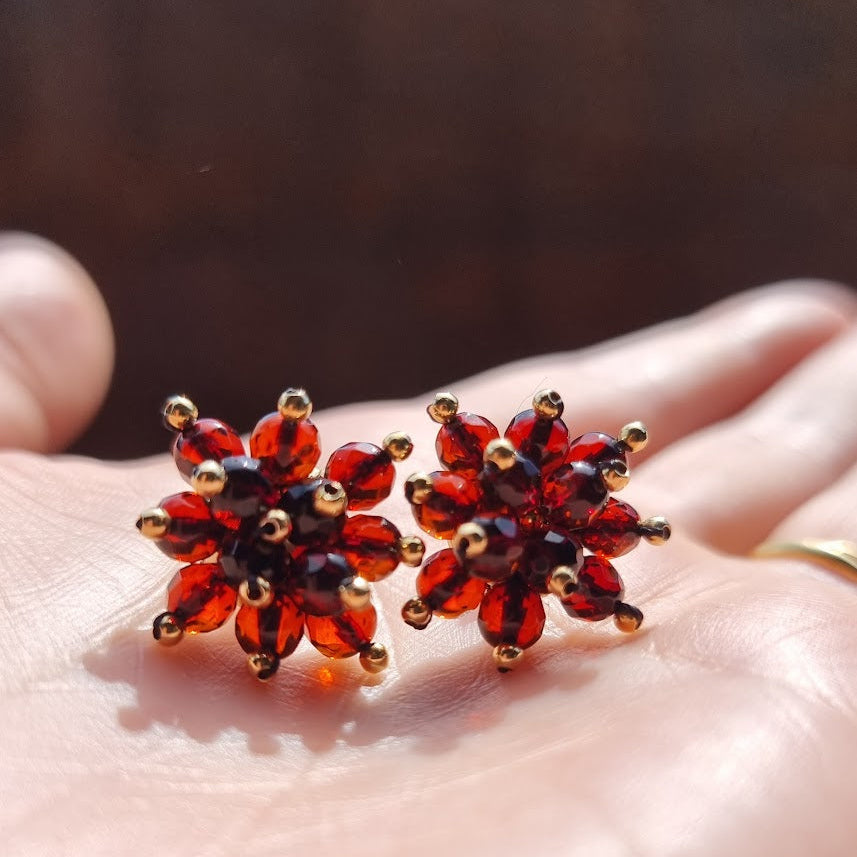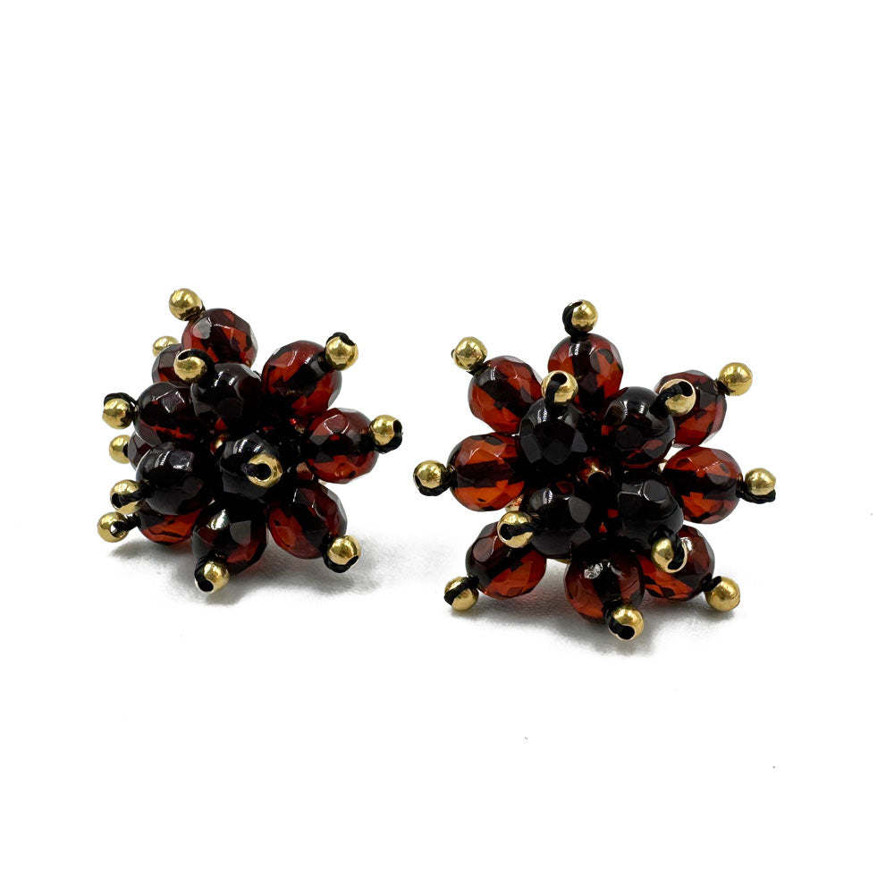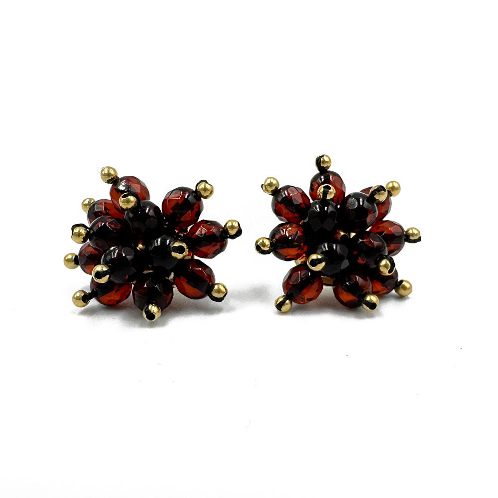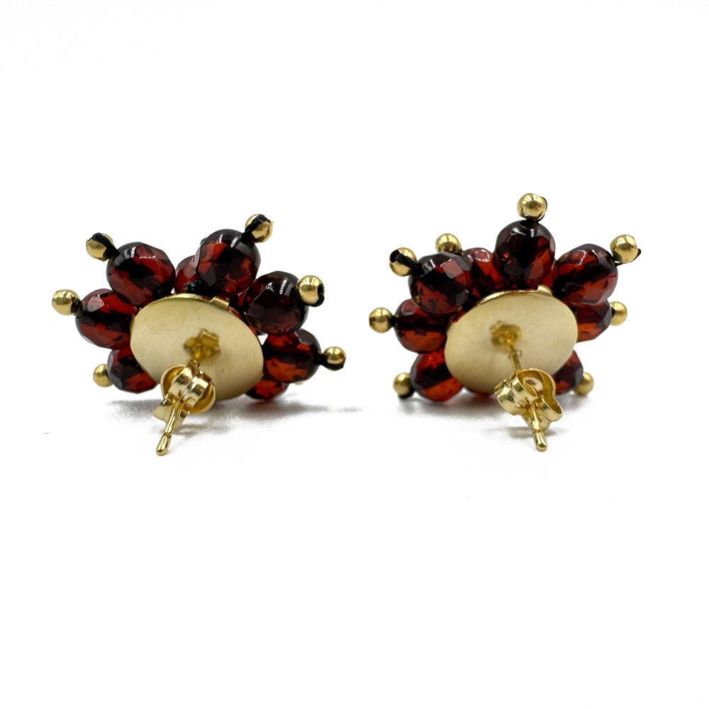 Cherry color Baltic amber faceted round shape beads stud earrings with 14k gold plated details.
