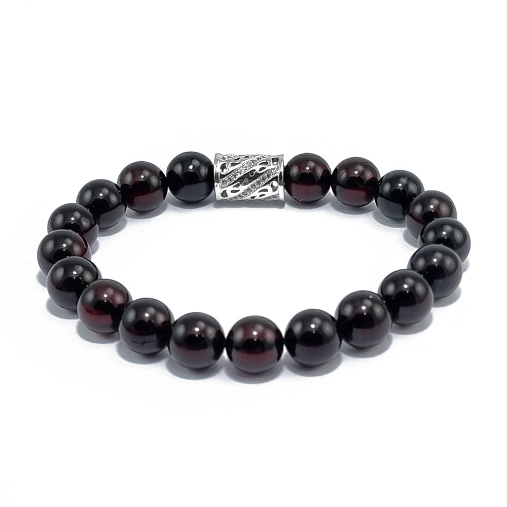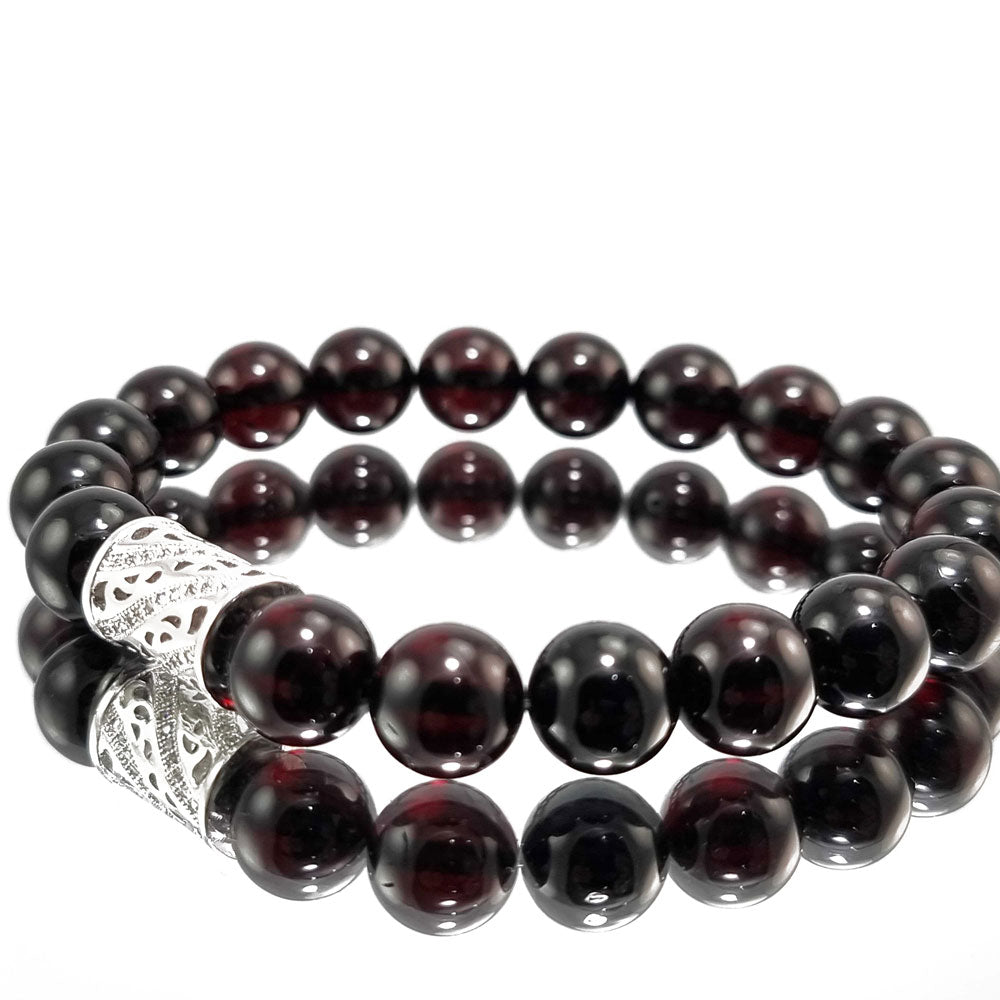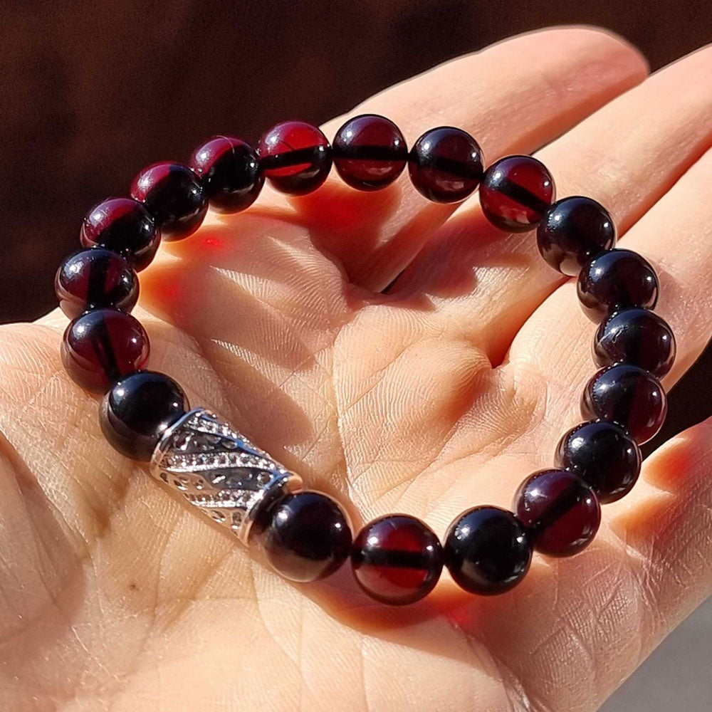 Baltic amber round beads stretch bracelet with brass ball Cherry color round Baltic amber beads Brass metal details 100% nickel and lead free Bead size:...