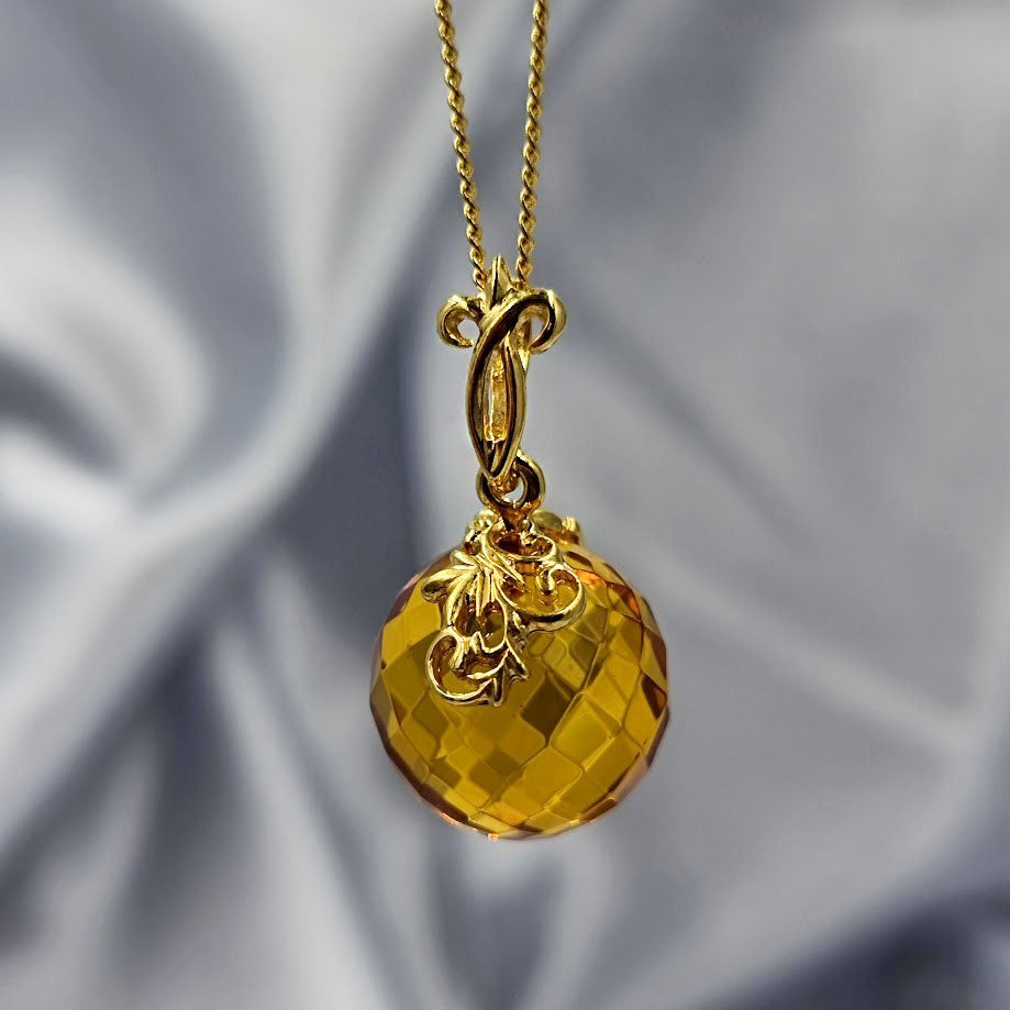 Cognac Amber Faceted Round Bead Pendant & Chain Necklace 14K Gold Plated