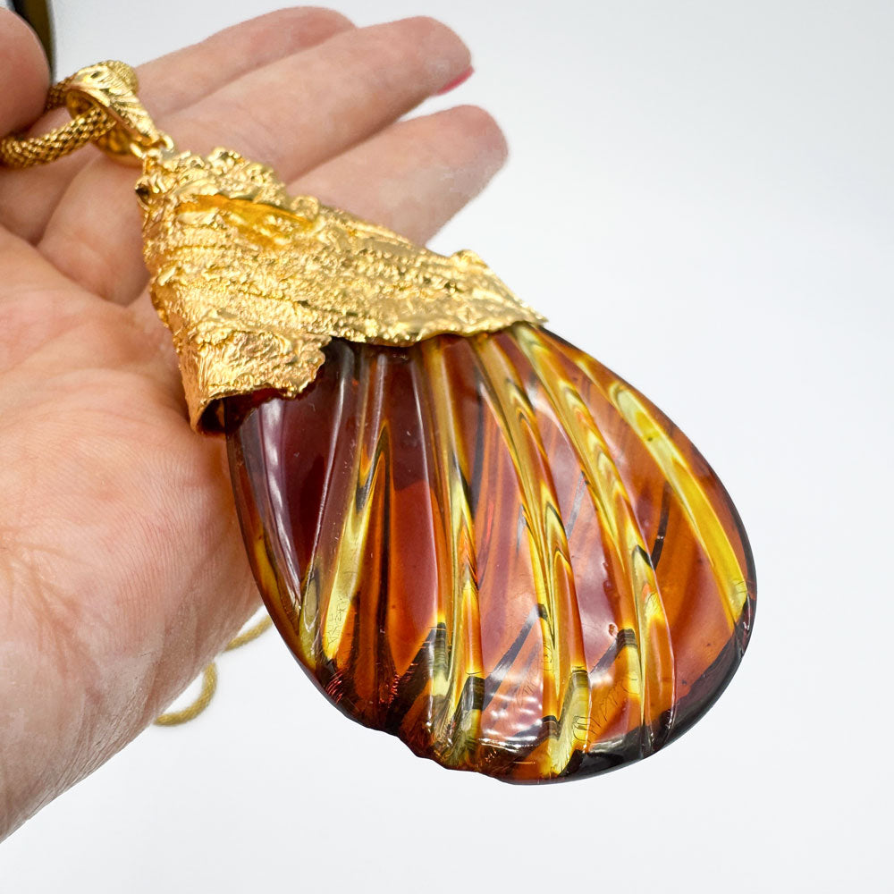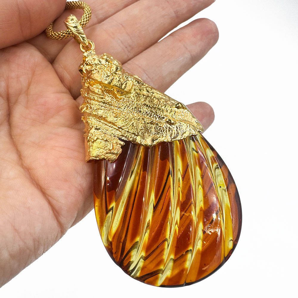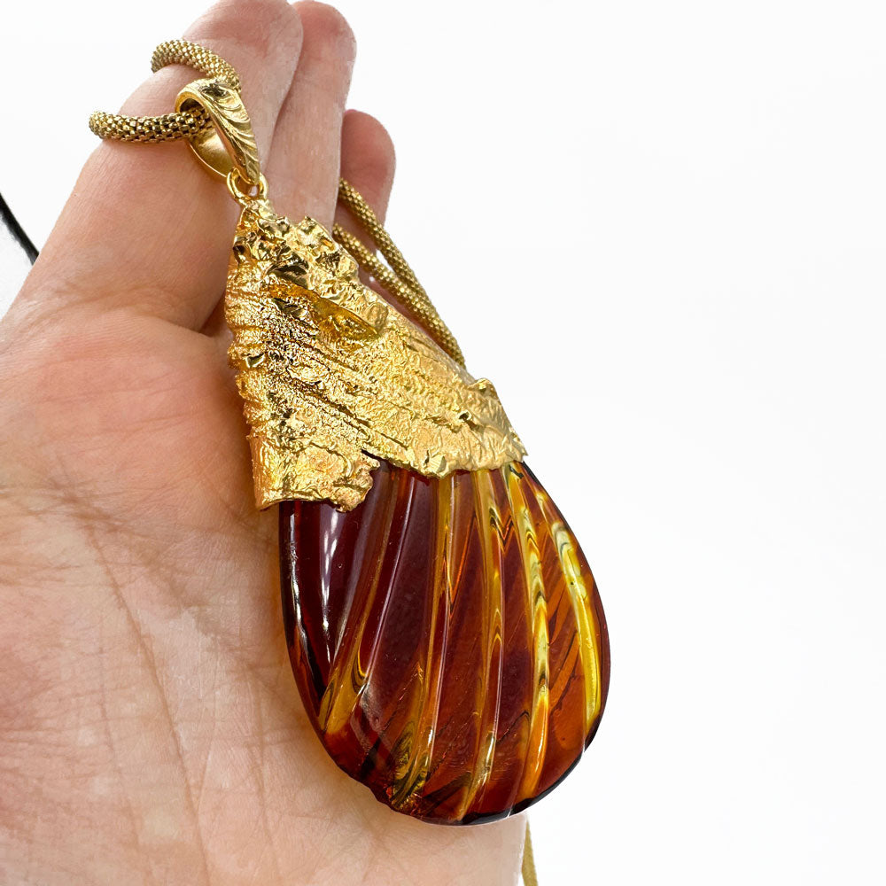 Carved Amber Drop Shape Pendant 14k Gold Plated
