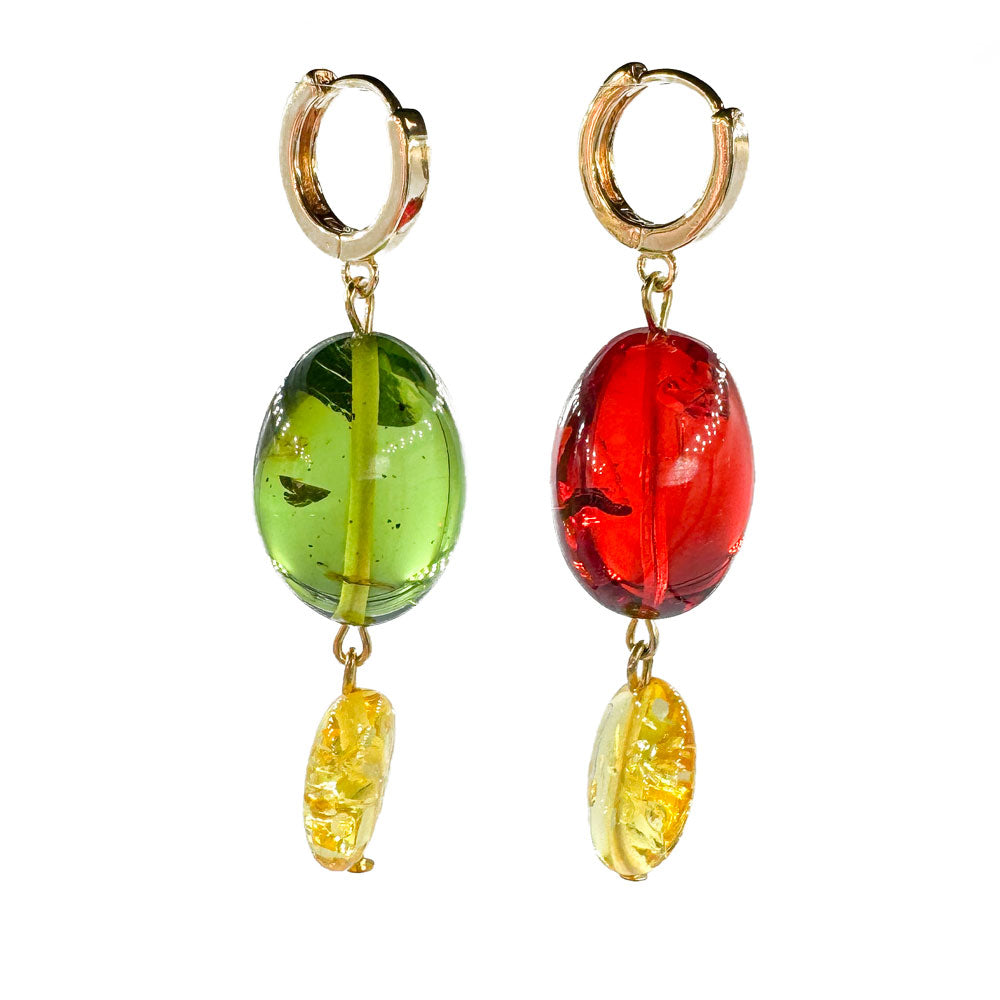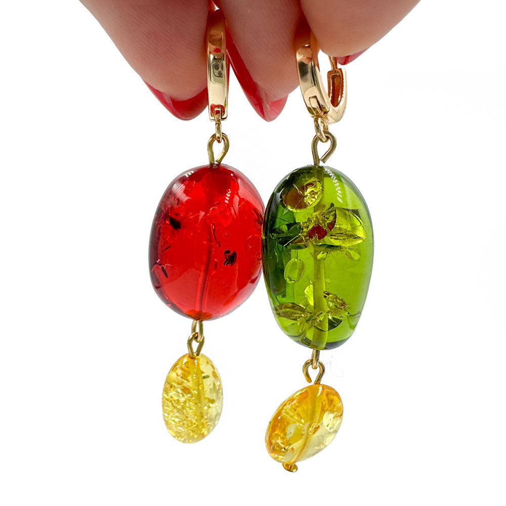 Natural Baltic and Caribbean Amber Multi-Color Nugget Shape Dangle earrings, gold plated
