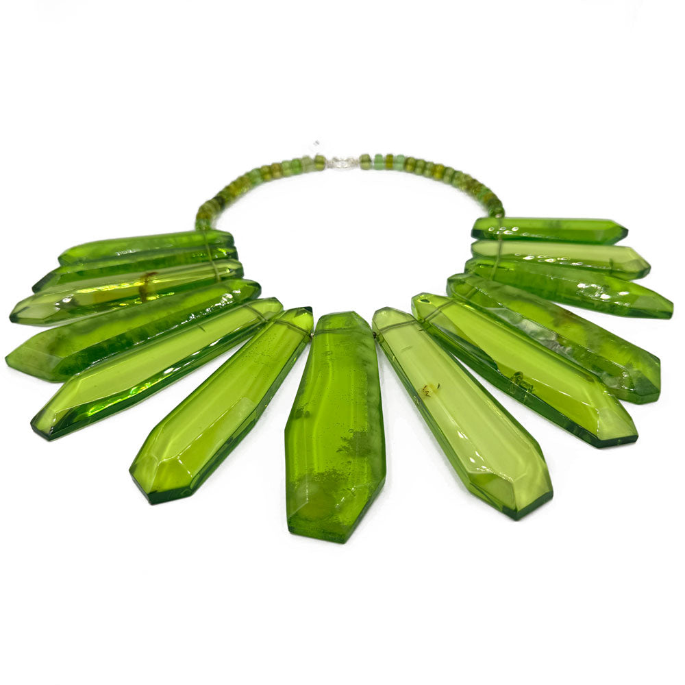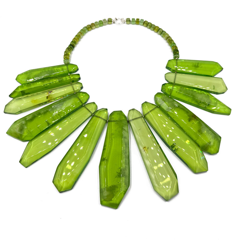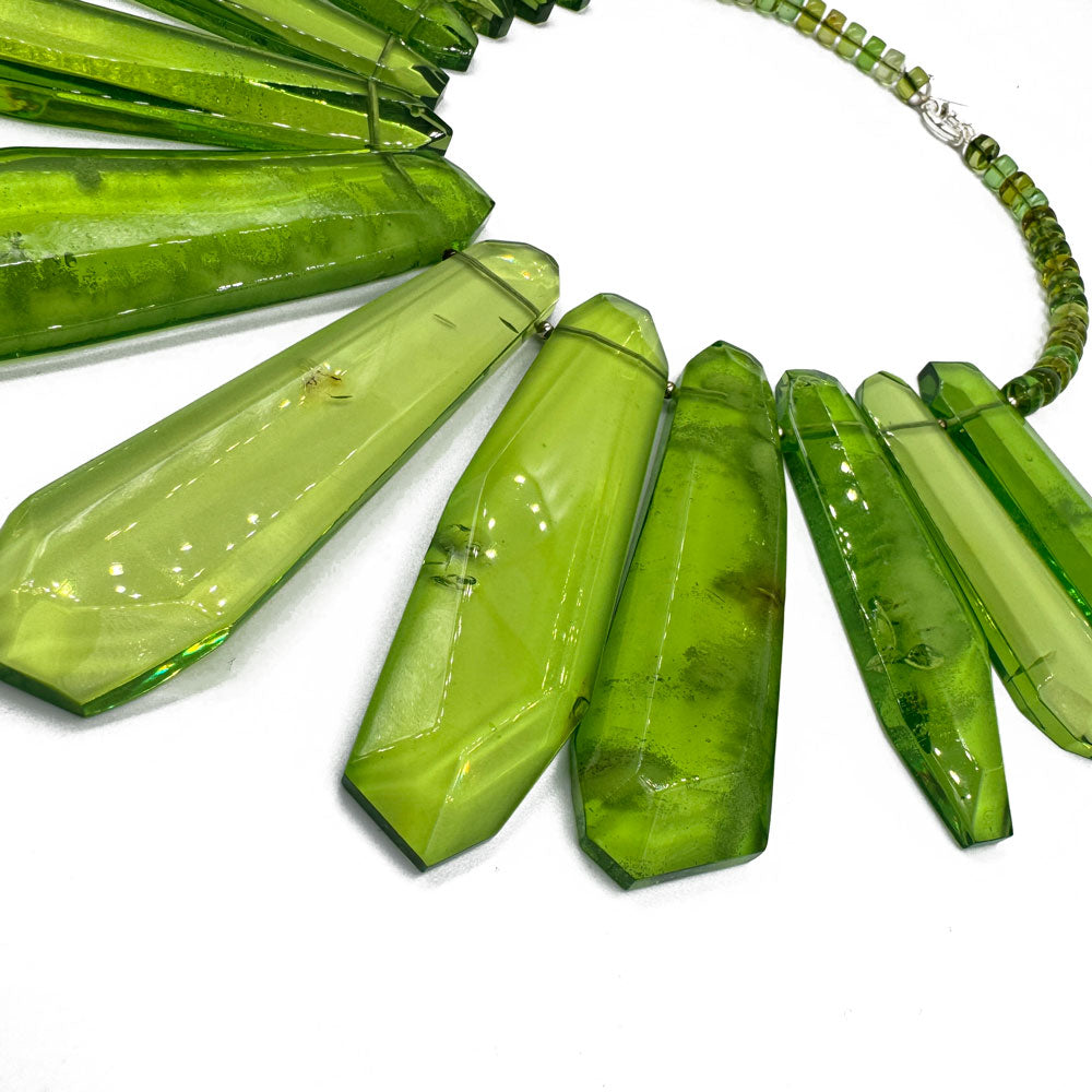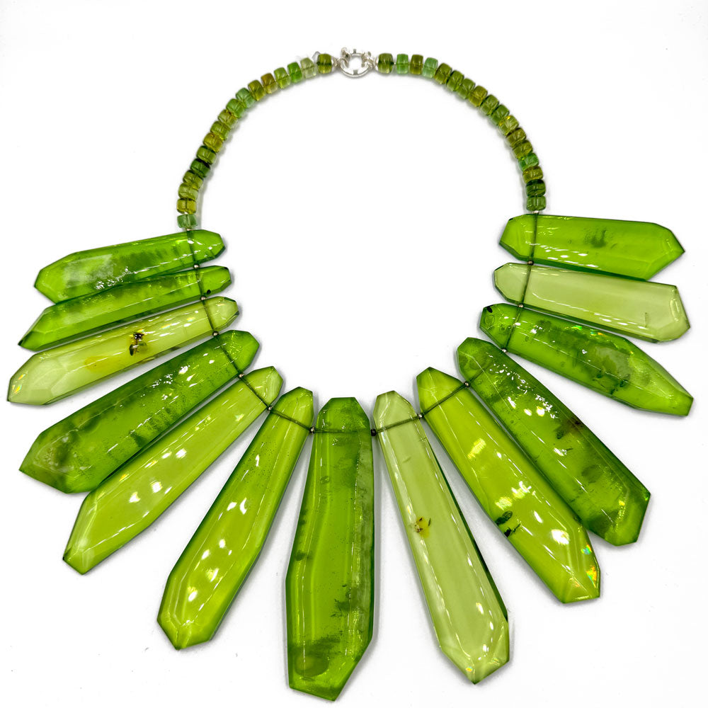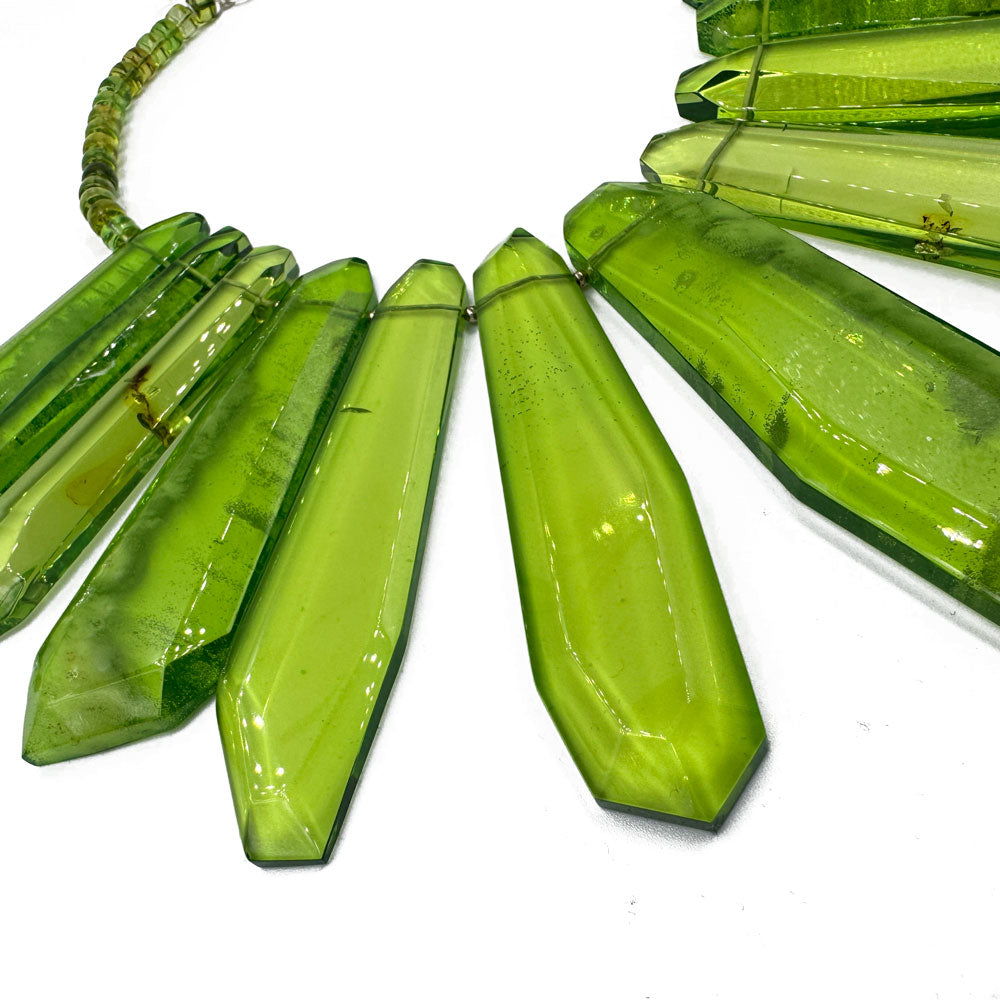 Green Amber Tablet & Crystal Beads Necklace Sterling Silver
