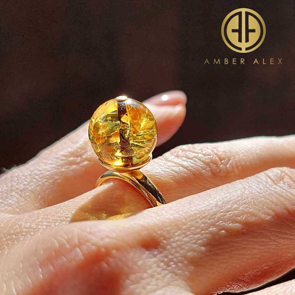 Lemon With Dark Flakes Amber Round Bead Adjustable Ring 14K Gold Plated